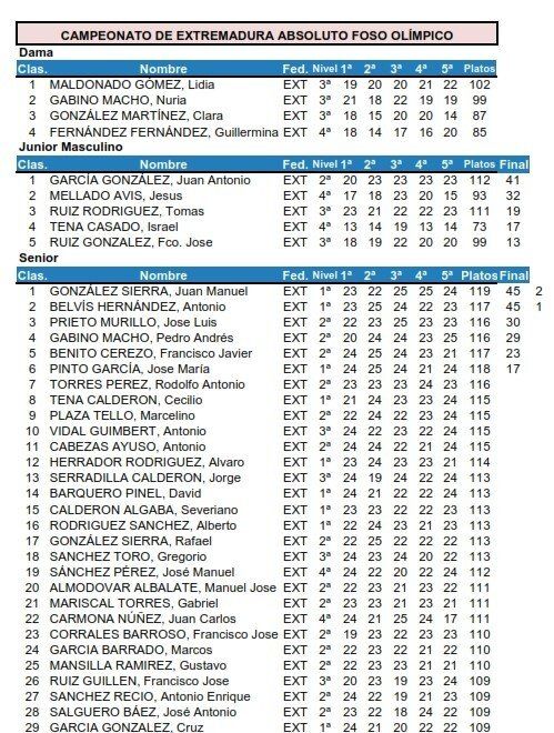 En el Campeonato Absoluto de Extremadura se alzó con la victoria Juan Manuel González Sierra, con 119 platos + 45 en la final + 2 en el SHOOT-OFF. En segundo lugar, Antonio Belvís Hernández con 117 platos + 45 en la final + 1 en el SHOOT-OFF. Y en tercer puesto, José Luis Prieto Murillo con 116 + 29 platos en la final. Queremos dar la enhorabuena a Pedro Gabino, Javier Benito y José María Pinto por su cuarto, quinto y sexto puesto respectivamente.
